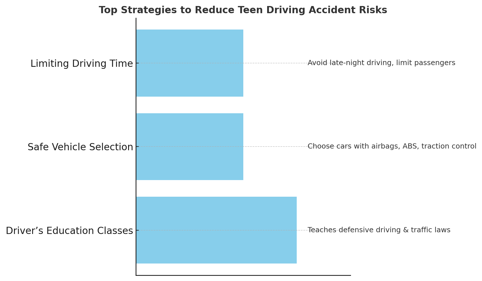 | Setting Rules | Ban texting, limit passengers, and enforce curfews. | Keeps distractions low and prevents dangerous behaviors that often lead to wrecks. |