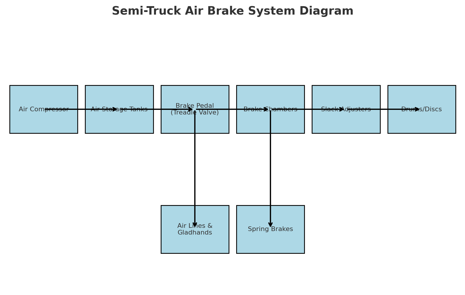 Understanding the complexity of a semi truck’s air brake system is critical when investigating truck wrecks. The diagram below shows how compressed air moves through each component—from the compressor and storage tanks to the brake chambers, slack adjusters, and drums/discs.